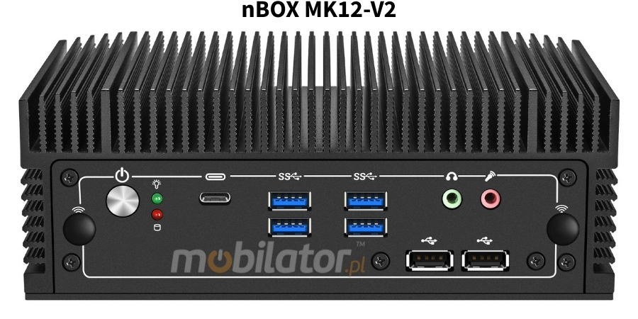 The reliable MobiPad nBOX MK12F-V2-I5 features an efficient, passive fanless cooling system based on a durable metal housing. This utilizes the natural principle of heat dissipation from the structure to the environment, completely eliminating moving components and fans. This solution guarantees silent operation, reduced failure rates, and high resistance to dust and dirt, enabling stable operation across a wide temperature range while maintaining the high energy efficiency of the Alder Lake series units.