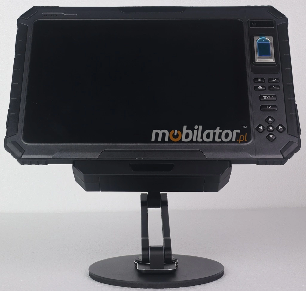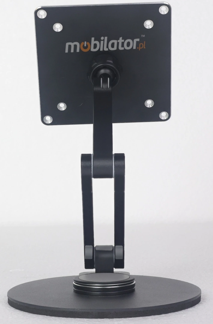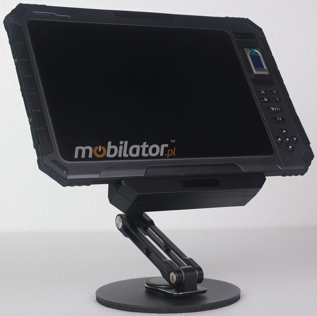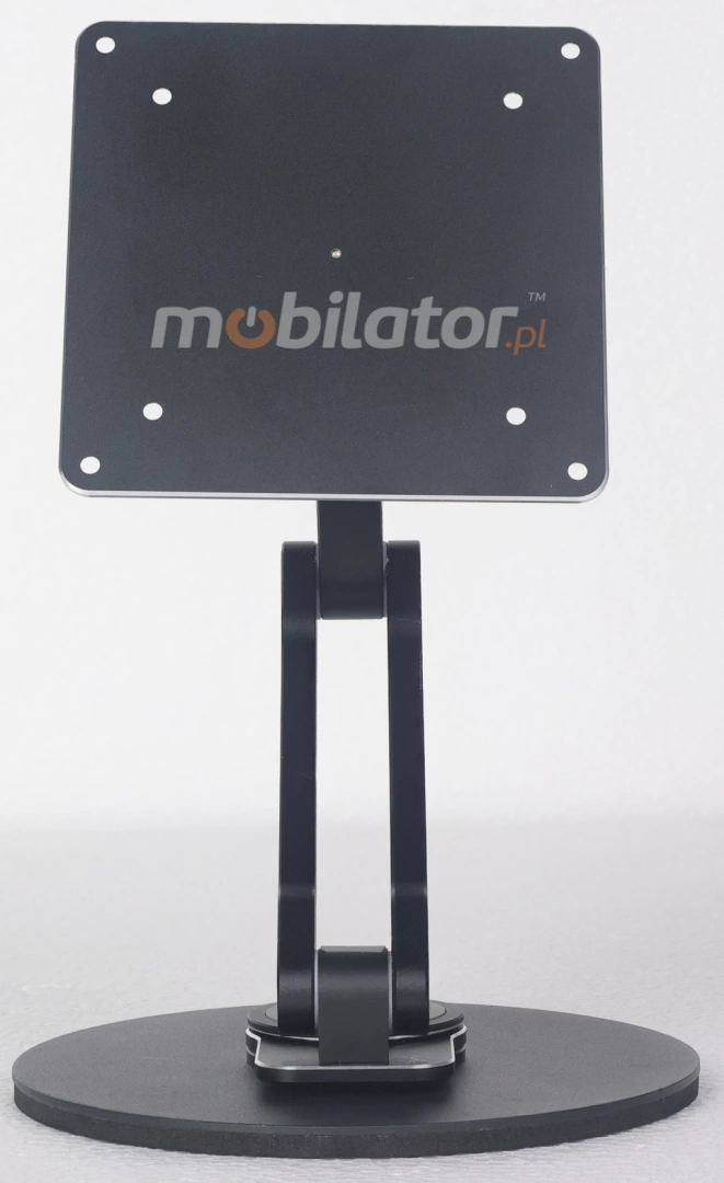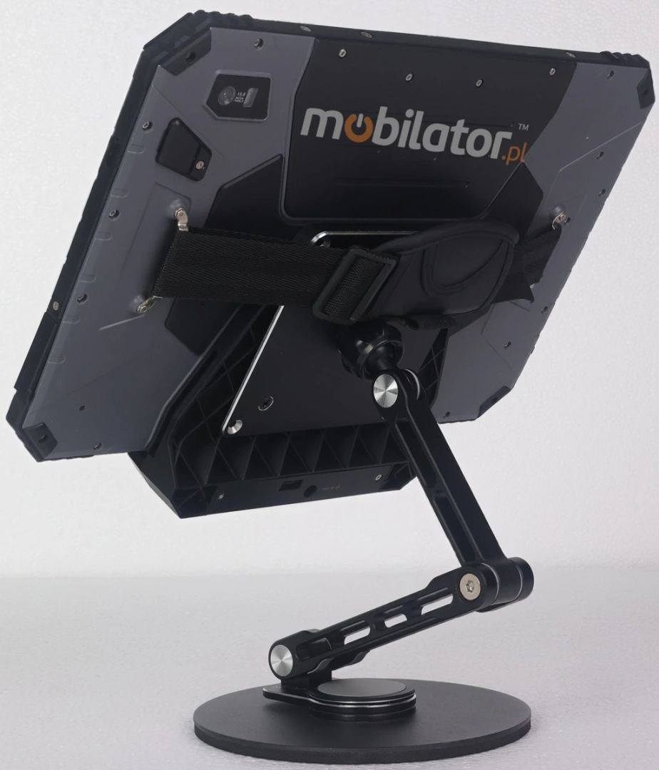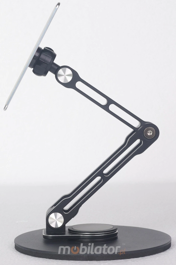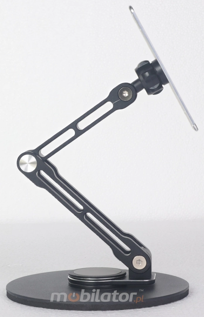 Dedicated to MobiPad Tex101 tablets, this professional desktop charging bracket provides a stable base for work. Its leg connects to a dedicated docking station using the VESA standard, ensuring continuous power through a built-in cable. The precisely crafted aluminum alloy construction guarantees durability, solidity, and efficiency in industrial applications. The set has dimensions of 323 x 170 x 155 mm and weighs 0.788 kg.