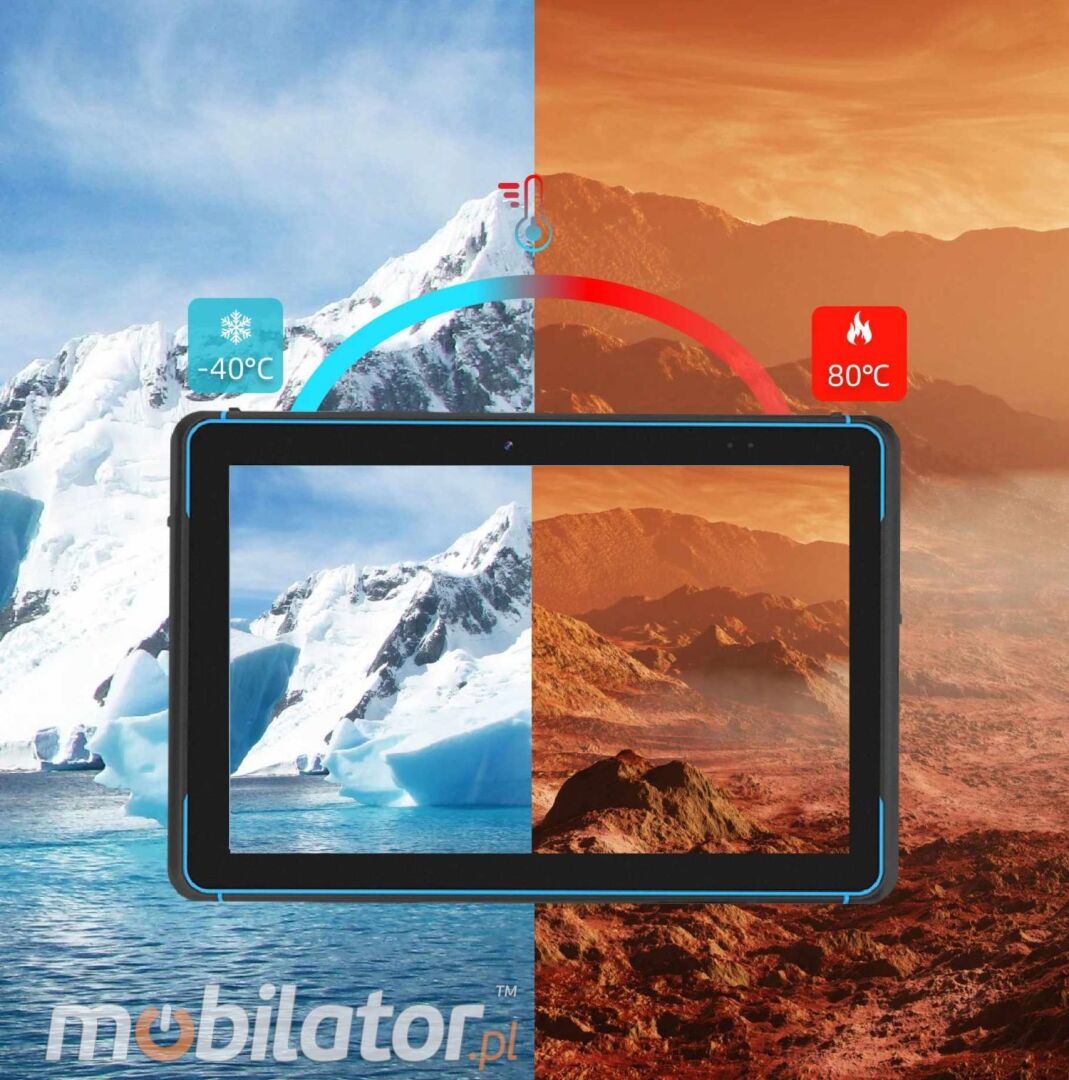 The professional MobiPad Tex105W tablet is designed for extreme temperature conditions. It can operate continuously between -20°C and 55°C, and in storage mode, it can withstand temperatures from -40°C to 80°C. The device is also suitable for high-humidity environments, handling relative humidity up to 95%.