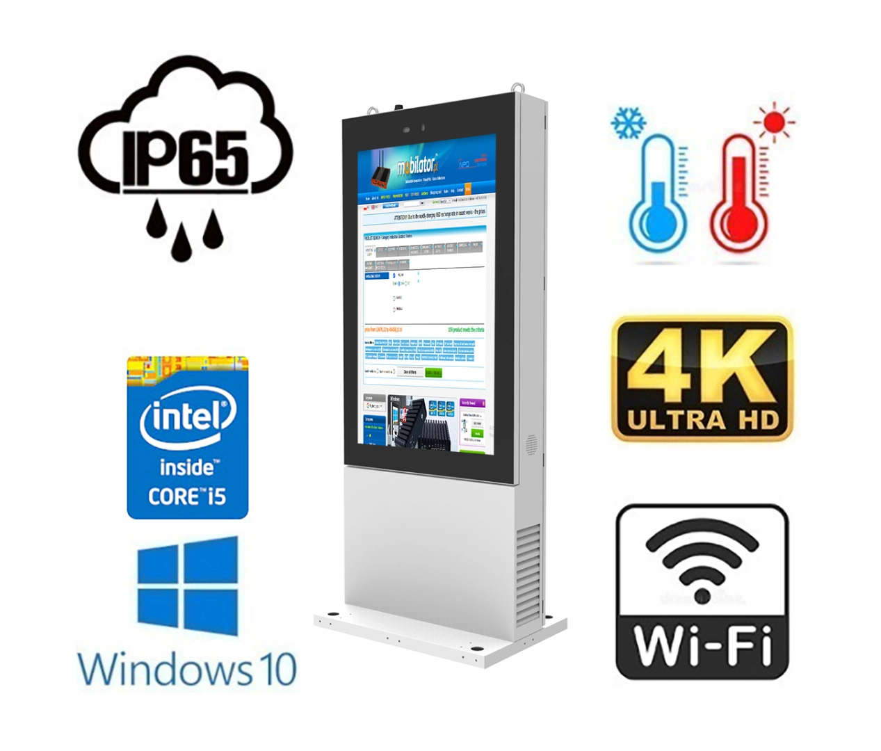 The panel housing with dimensions of 2130mm x 880mm x 230mm is made of the highest quality metal covered with a galvanic coating, which ensures a very high resistance of the device to mechanical damage and severe weather conditions, rain, fog, snow and frost. This model, weighing 130.0 kg, is ready for use at any time, even in difficult conditions such as heat or cold. Digital Singage Player - Windows 55 inch Advertising and information totem NoMobi Trex is a series of devices designed for applications requiring continuous operation - 24 hours a day, 7 days a week.