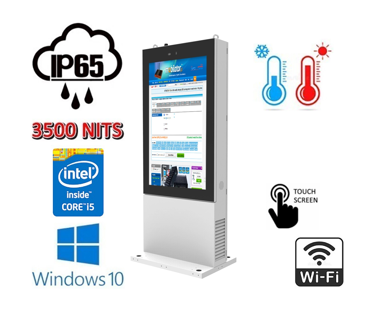 NoMobi Trex is adapted to continuous operation both at very low and high temperatures in the range from -20 ° C to 50 ° C. If the device is turned off, it can cope with temperatures ranging from -20 ° C to 60 ° C. In addition, the durable LCD totem is perfect for conditions with increased humidity, ensuring proper functioning even in the case of 90% relative air humidity.