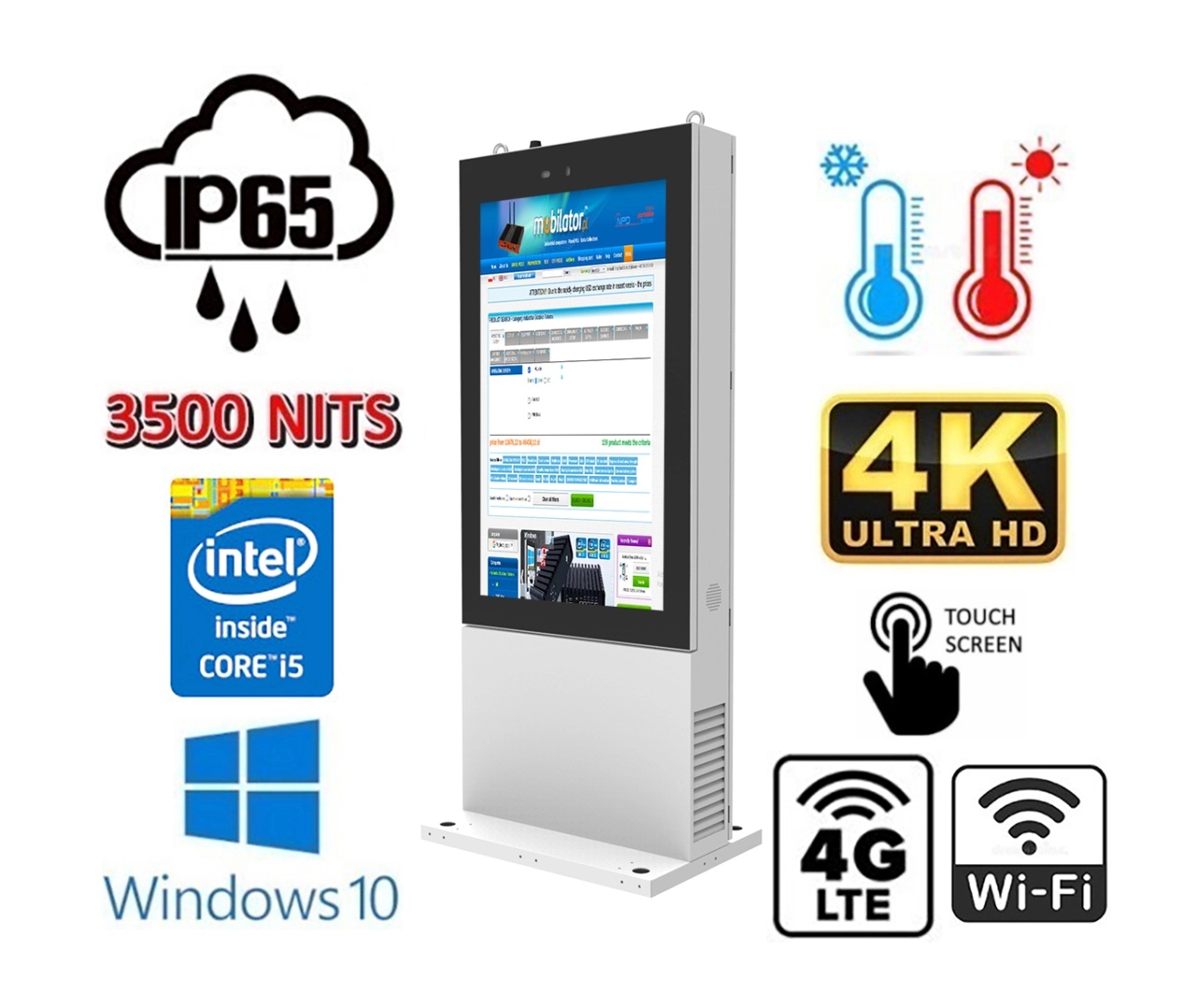 The panel housing with dimensions of 2130mm x 880mm x 230mm is made of the highest quality metal covered with a galvanic coating, which ensures a very high resistance of the device to mechanical damage and severe weather conditions, rain, fog, snow and frost. This model, weighing 130.0 kg, is ready for use at any time, even in difficult conditions such as heat or cold. Digital Singage Player - Windows 55 inch Advertising and information totem NoMobi Trex is a series of devices designed for applications requiring continuous operation - 24 hours a day, 7 days a week.