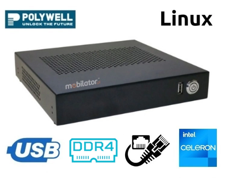 Small dimensions industrial computers excel in environments where dust, dirt and moisture predominate. They are ideal for applications requiring quiet operation. Small and reliable MiniPC use heat-pipe technology and aluminum fins for passive cooling. The robust mini Industrial Computer Polywell-J4125AEL2 Celeron is a device designed for all industrial and non-continuous applications requiring continuous operation - 24 hours, 7 days a week.