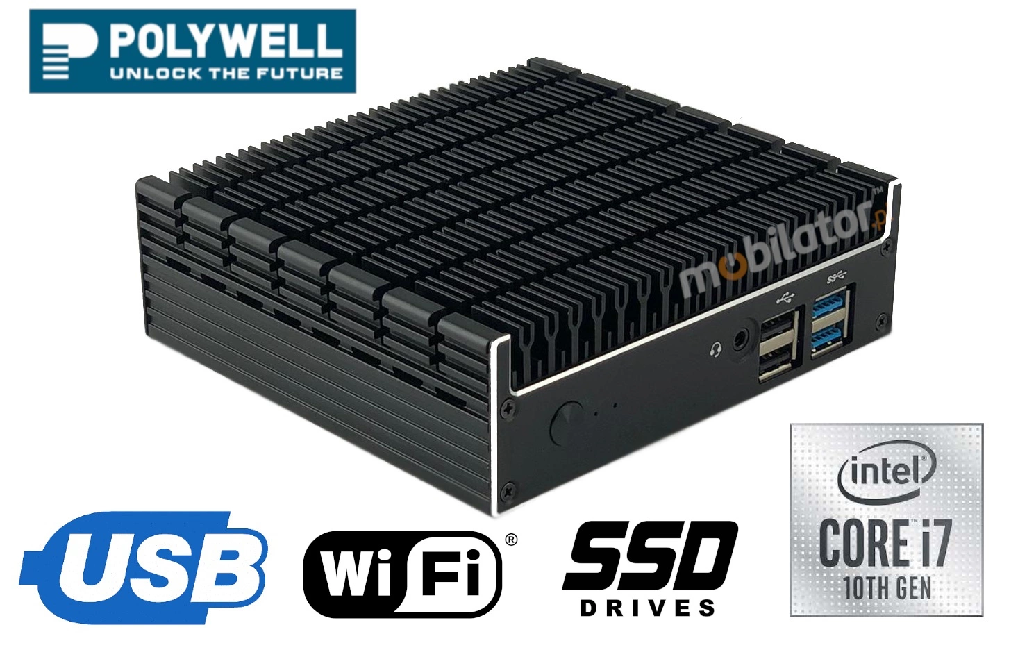 Small dimensions industrial computers excel in environments where dust, dirt and moisture predominate. They are ideal for applications requiring quiet operation. Small and reliable MiniPC use heat-pipe technology and aluminum fins for passive cooling. The robust mini Industrial Computer Polywell-Nano-U10F is a device designed for all industrial and non-continuous applications requiring continuous operation - 24 hours, 7 days a week.