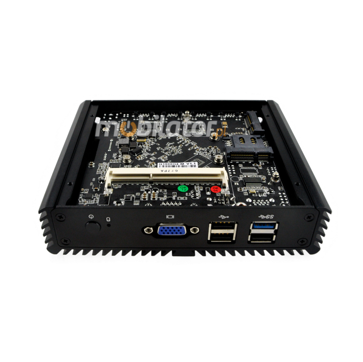 Detailed device specification is available in the "Technical data" tab.The industrial Mini PC uses a proven cooling system, based only on solid elements, mainly heat sinks. The system uses the phenomenon of metals passing thermal energy into the environment - there are no additional moving elements in the form of eg fans. This solution ensures noiseless operation, lower failure rate and greater protection against dust and other dirt while reducing the amount of energy consumed.