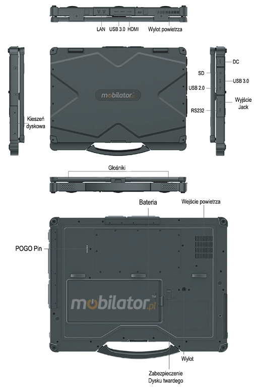The industrial Emdoor Notebook uses a proven cooling system, based only on solid elements, mainly heat sinks. The system uses the phenomenon of metals passing thermal energy into the environment - there are no additional moving elements in the form of eg fans. This solution ensures noiseless operation, lower failure rate and greater protection against dust and other dirt while reducing the amount of energy consumed.