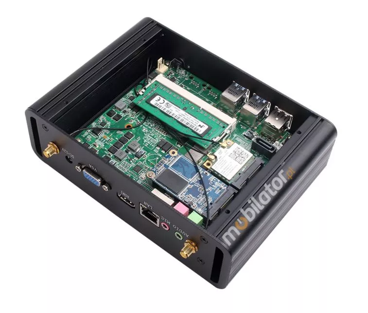 The industrial Mini PC uses a proven cooling system, based only on solid elements, mainly heat sinks. The system uses the phenomenon of metals passing thermal energy into the environment - there are no additional moving elements in the form of eg fans. This solution ensures noiseless operation, lower failure rate and greater protection against dust and other dirt while reducing the amount of energy consumed.