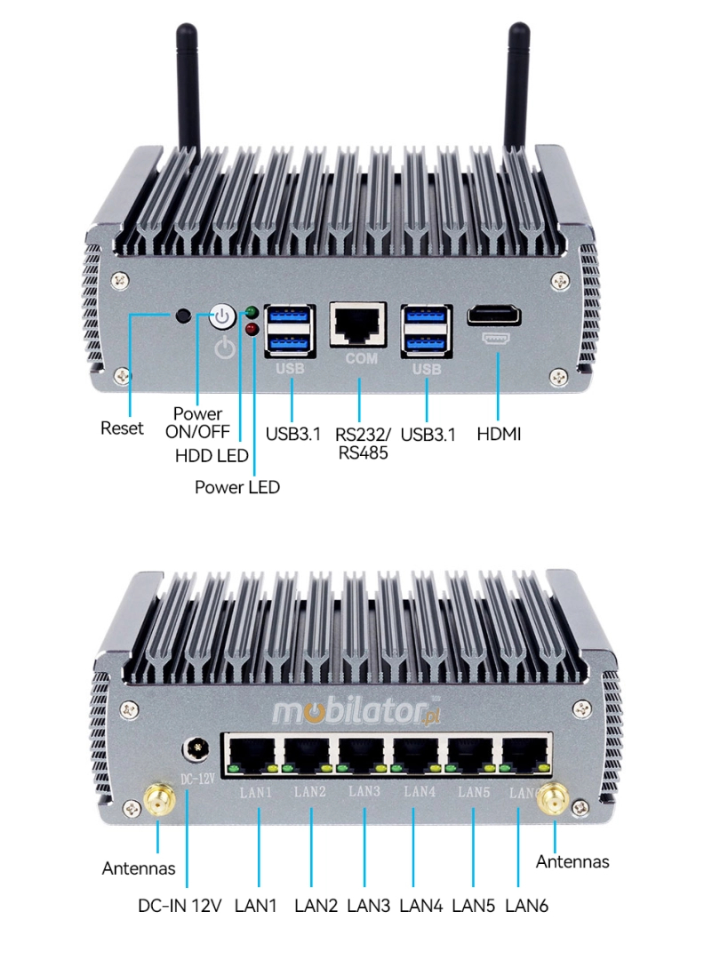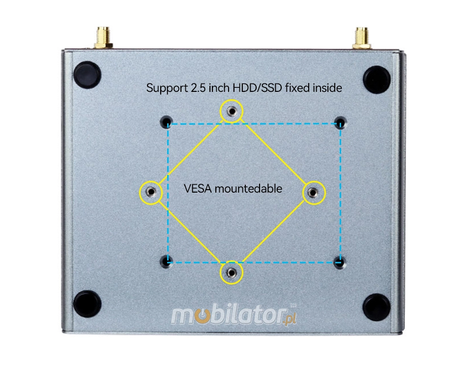 The passive cooling system used in the MiniPC yBOX-X56 make this computer very resistant to various types of mechanical injuries. An additional advantage of industrial computers is a solid construction made of high quality aluminum and specially designed in such a way that in addition to high efficiency in heat dissipation, it can also resist any external damage.