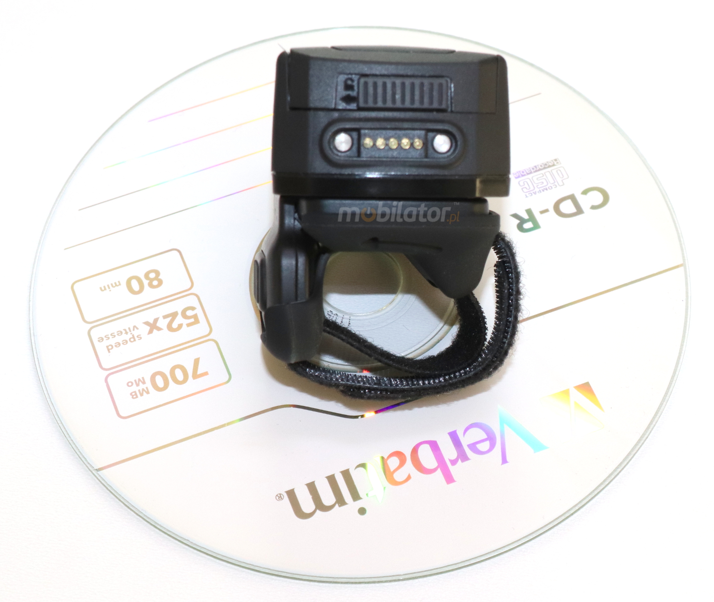 Nowej generacji mini skaner zaskakuje swoim wyglądem, przypomina pudełko zapałek, do którego na spodniej części został doczepiony pierścień służący do nakładania urządzenia na palec wskazujący. Ten ergonomiczny, niewielki i wyjątkowo lekki czytnik kodów kreskowych o odpowiedniej fakturze powierzchni, zapewnia dobre trzymanie i ogranicza zmęczenie dłoni przy wielogodzinnej pracy.