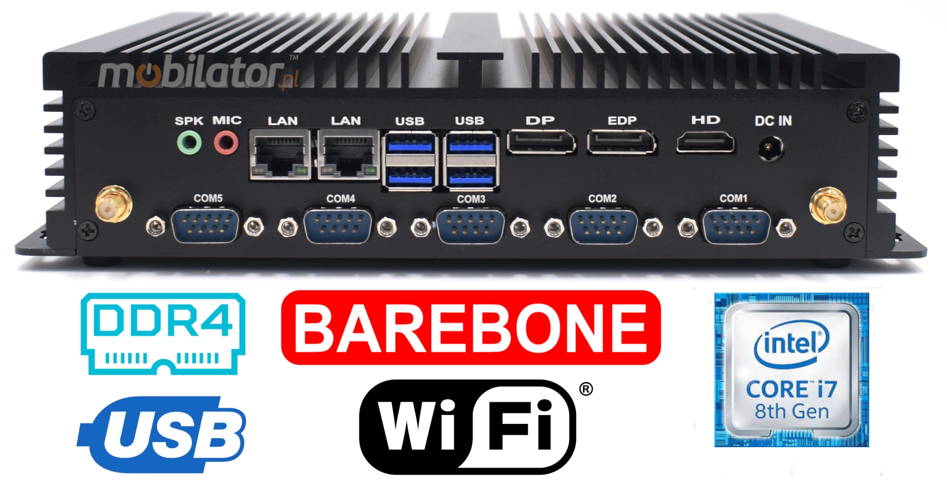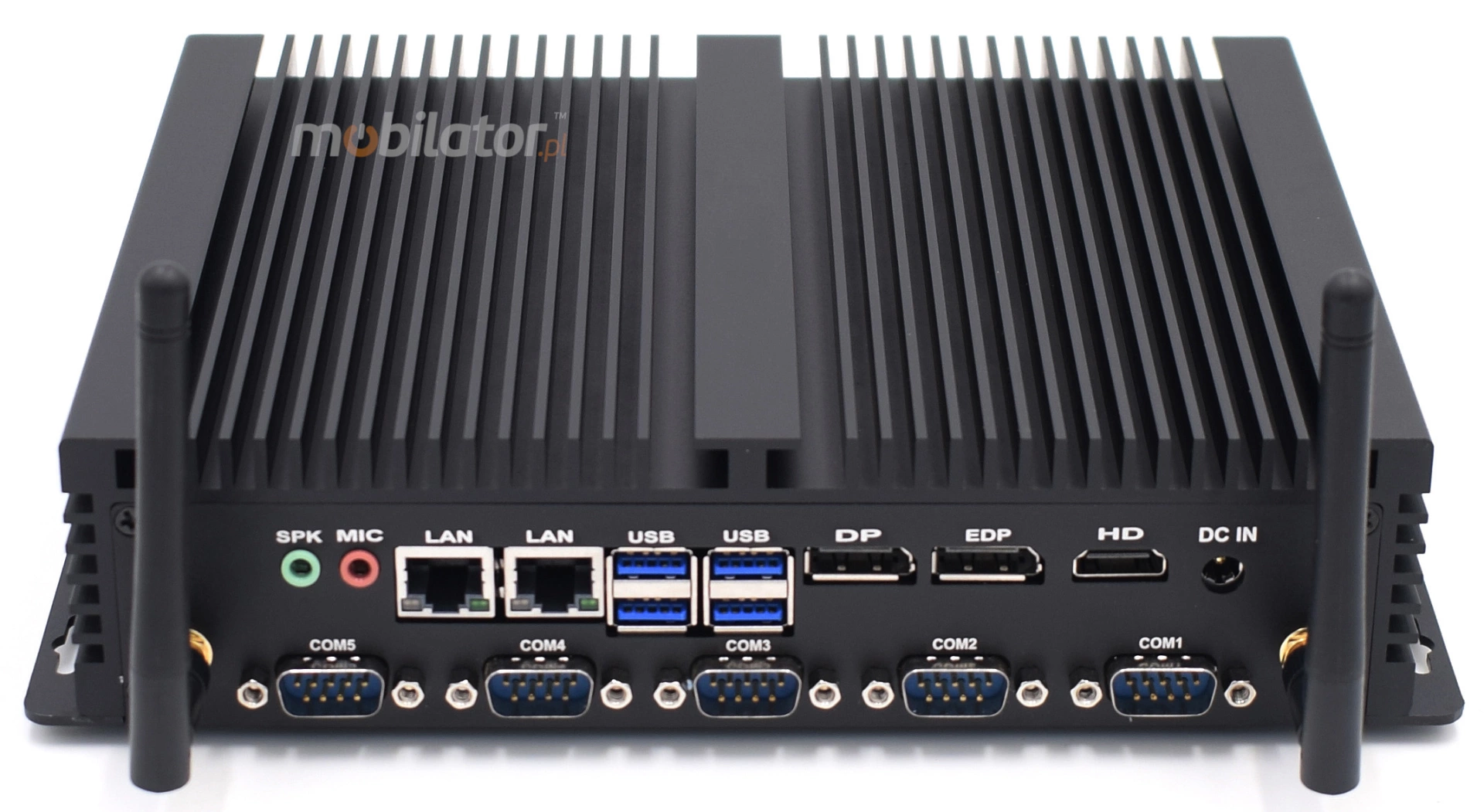 2x RJ45 LAN | 1x HDMI | 5x RS232 COM | 4x USB 3.0 1x DP | 1x DC | 1x EDP | 1x SPK | 1x Mic | 2x Antena WiFi |