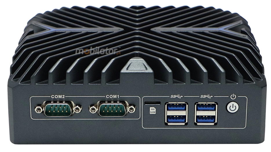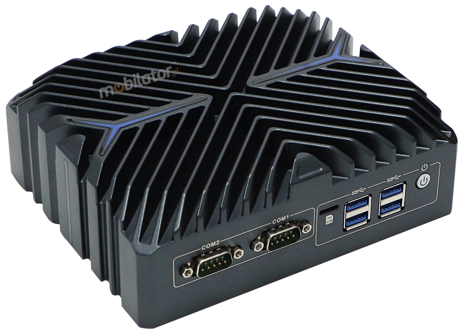 W przemysłowym Mini PC dostępna jest również opcja chłodzenia aktywnego (fan), wykorzystującego wentylator zapewniający efektywne odprowadzanie ciepła z podzespołów urządzenia. Wentylator kieruje ciepło na zewnątrz, zapewniając wydajne chłodzenie. Żebra chłodzące wspomagają ten proces, efektywnie rozpraszając nagromadzone ciepło. System ten gwarantuje utrzymanie optymalnej temperatury pracy nawet przy dużym obciążeniu, co pozwala na stabilne działanie w wymagających warunkach. Chłodzenie aktywne można wybrać jako opcję przy zamówieniu urządzenia, dostosowując konfigurację do indywidualnych potrzeb użytkownika. Wersja z chłodzeniem aktywnym posiada lekko zmodyfikowaną obudowę, przystosowaną do montażu wentylatora i zapewniającą optymalny przepływ powietrza.