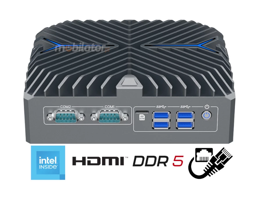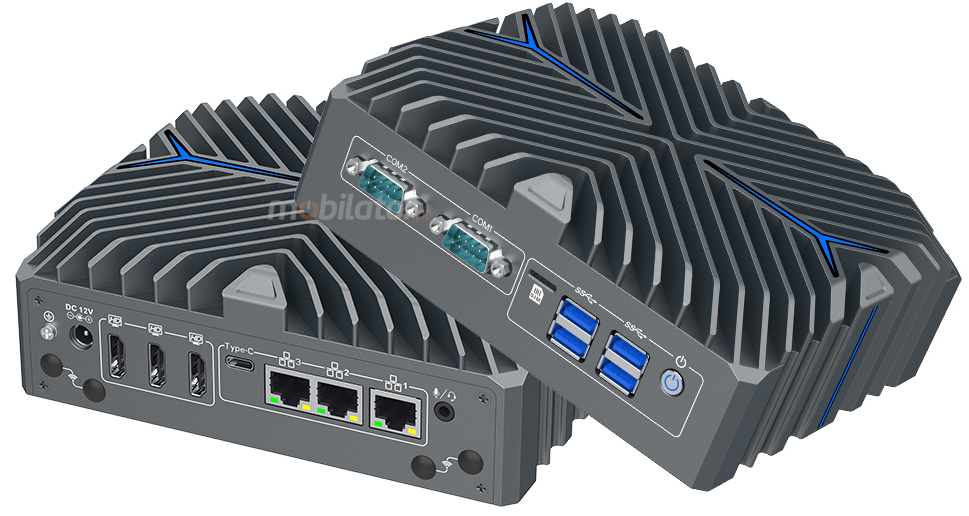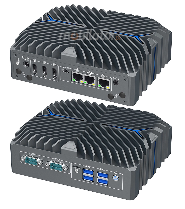 W przemysłowym Mini PC dostępna jest również opcja chłodzenia aktywnego (fan), wykorzystującego wentylator zapewniający efektywne odprowadzanie ciepła z podzespołów urządzenia. Wentylator kieruje ciepło na zewnątrz, zapewniając wydajne chłodzenie. Żebra chłodzące wspomagają ten proces, efektywnie rozpraszając nagromadzone ciepło. System ten gwarantuje utrzymanie optymalnej temperatury pracy nawet przy dużym obciążeniu, co pozwala na stabilne działanie w wymagających warunkach. Chłodzenie aktywne można wybrać jako opcję przy zamówieniu urządzenia, dostosowując konfigurację do indywidualnych potrzeb użytkownika. Wersja z chłodzeniem aktywnym posiada lekko zmodyfikowaną obudowę, przystosowaną do montażu wentylatora i zapewniającą optymalny przepływ powietrza.