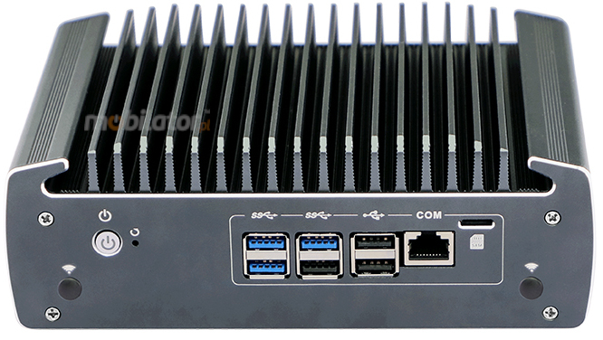 W przemysłowym Mini PC dostępna jest również opcja chłodzenia aktywnego (fan), wykorzystującego wentylator zapewniający efektywne odprowadzanie ciepła z podzespołów urządzenia. Wentylator kieruje ciepło na zewnątrz, zapewniając wydajne chłodzenie. Żebra chłodzące wspomagają ten proces, efektywnie rozpraszając nagromadzone ciepło. System ten gwarantuje utrzymanie optymalnej temperatury pracy nawet przy dużym obciążeniu, co pozwala na stabilne działanie w wymagających warunkach. Chłodzenie aktywne można wybrać jako opcję przy zamówieniu urządzenia, dostosowując konfigurację do indywidualnych potrzeb użytkownika. Wersja z chłodzeniem aktywnym posiada lekko zmodyfikowaną obudowę, przystosowaną do montażu wentylatora i zapewniającą optymalny przepływ powietrza.