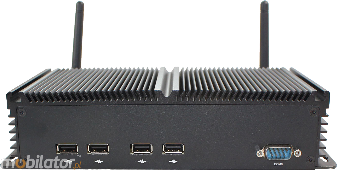 Zintegrowana karta sieciowa - Intel WGI211AT oraz moduł WiFi umożliwiaja podłączenie urządzenia do sieci. Komputer wyposażony jest w: dwa złącza LAN, pięć portów USB 2.0, jedno wyjście VGA, jeden port USB 3.0, jedno wyjścieHDMI, sześć portów COM(RS232) (opcjonalnie COM1 i COM2 mogą być zamienione na RS422/485), jedno wejście Audio, jedno wejście mikrofonowe.