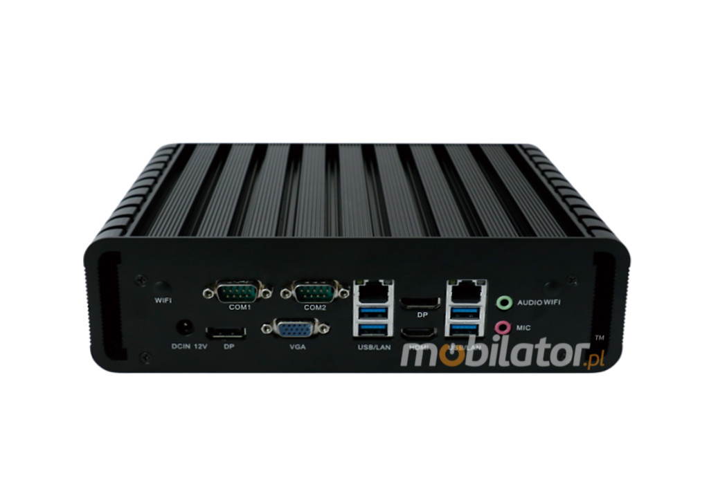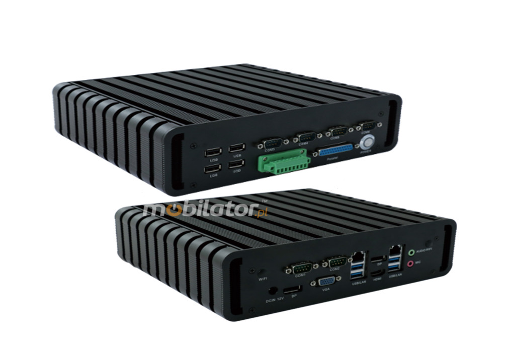 Zintegrowane karty sieciowe - Intel L210/L217 Lan oraz moduł WiFi umożliwiaja podłączenie urządzenia do sieci. Komputer wyposażony jest miedzy innymi w: cztery porty USB 2.0, jedno wyjście VGA, cztery porty USB 3.0, jedno wyjścieHDMI, sześć portów COM(RS232) (w tym 2 wejscia ze wsparciem dla RS422/485), jeden port LPT, jedno wejście Audio, jedno wejście mikrofonowe.