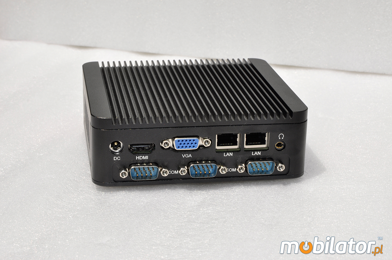 Zintegrowana karta sieciowa - Intel RTL8111E Lan (opcjonalnie moduł WiFi) umożliwiaja podłączenie urządzenia do sieci. Komputer wyposażony jest w: dwa złącza LAN, cztery porty COM(RS232), jedno wyjście VGA, trzy porty USB 2.0, jeden port USB 3.0, jedno wyjście HDMI, jedno wejście Audio, jedno wejście mikrofonowe.