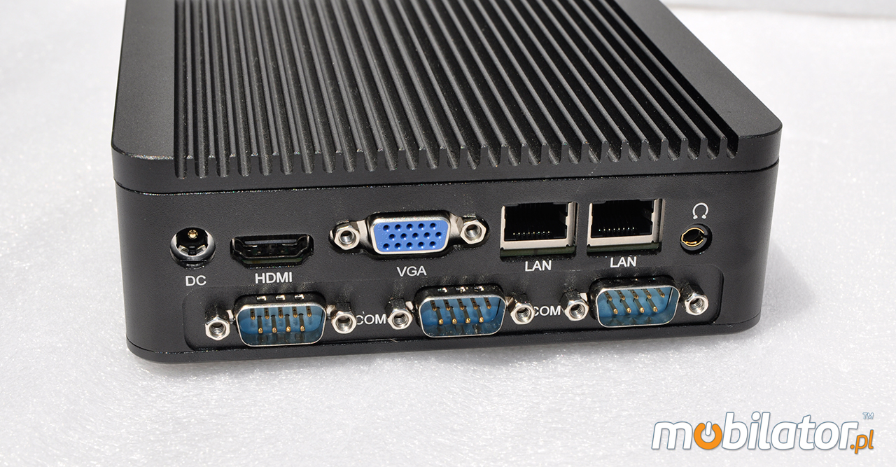 Zintegrowana karta sieciowa - Intel RTL8111E Lan (opcjonalnie moduł WiFi) umożliwiaja podłączenie urządzenia do sieci. Komputer wyposażony jest w: dwa złącza LAN, cztery porty COM(RS232), jedno wyjście VGA, trzy porty USB 2.0, jeden port USB 3.0, jedno wyjście HDMI, jedno wejście Audio, jedno wejście mikrofonowe.