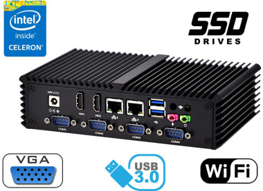 Dwie zintegrowane karty sieciowe Intel I211-AT- 10/100/1000 Controller umo¿liwiaja pod³±czenie urz±dzenia do sieci. Komputer wyposa¿ony jest w: dwa z³±cza LAN, cztery port USB 3.0, dwa porty USB 2.0, dwa wyj¶cia HDMI, piêæ portów COM (RS232), jeden port VGA jedno wyj¶cie audio, jedno wej¶cie mikrofonowe.