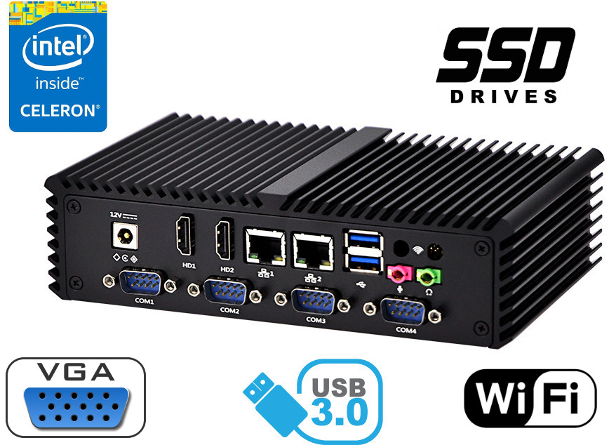 Dwie zintegrowane karty sieciowe Intel I211-AT- 10/100/1000 Controller umożliwiaja podłączenie urządzenia do sieci. Komputer wyposażony jest w: dwa złącza LAN, cztery port USB 3.0, dwa porty USB 2.0, dwa wyjścia HDMI, pięć portów COM (RS232), jeden port VGA jedno wyjście audio, jedno wejście mikrofonowe.