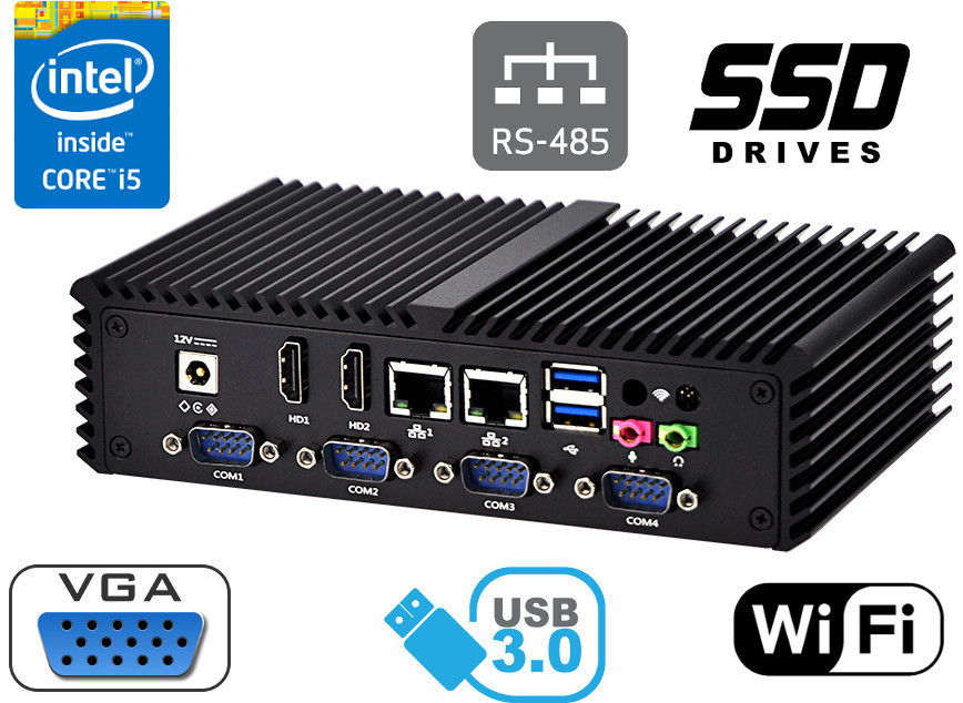 Dwie zintegrowane karty sieciowe Intel I211-AT- 10/100/1000 Controller umożliwiaja podłączenie urządzenia do sieci. Komputer wyposażony jest w: dwa złącza LAN, cztery port USB 3.0, dwa porty USB 2.0, dwa wyjścia HDMI, cztery porty COM (RS232), jeden port COM (RS485), jeden port VGA, jedno wyjście audio, jedno wejście mikrofonowe.
