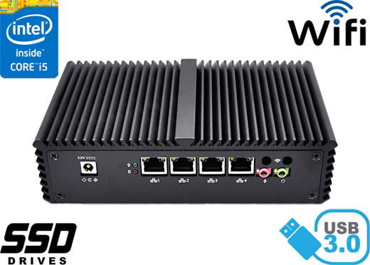 Zintegrowane karty sieciowe Intel I211-AT- 10/100/1000 Controller oraz moduł WiFi umożliwiają podłączenie urządzenia do sieci. Komputer wyposażony jest w: cztery złącza LAN, dwa porty USB 3.0, dwa porty USB 2.0, jedno wyjście HDMI, jeden port COM(RS232), jedno wyjście audio, jedno wejście mikrofonowe oraz złącza wbudowane na płycie głównej: jeden port SATA, jeden port MINI-PCIE.
