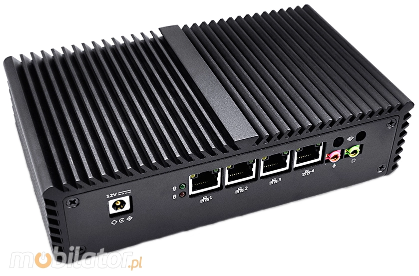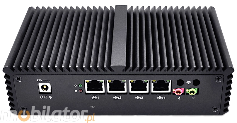 Zintegrowane karty sieciowe Intel I211-AT- 10/100/1000 Controller oraz moduł WiFi umożliwiają podłączenie urządzenia do sieci. Komputer wyposażony jest w: cztery złącza LAN, dwa porty USB 3.0, dwa porty USB 2.0, jedno wyjście HDMI, jeden port COM(RS232), jedno wyjście audio, jedno wejście mikrofonowe oraz złącza wbudowane na płycie głównej: jeden port SATA, jeden port MINI-PCIE.