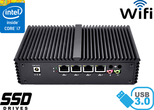 Zintegrowane karty sieciowe Intel I211-AT- 10/100/1000 Controller oraz moduł WiFi umożliwiają podłączenie urządzenia do sieci. Komputer wyposażony jest w: cztery złącza LAN, dwa porty USB 3.0, dwa porty USB 2.0, jedno wyjście HDMI, jeden port COM(RS232), jedno wyjście audio, jedno wejście mikrofonowe oraz złącza wbudowane na płycie głównej: jeden port SATA, jeden port MINI-PCIE.