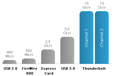 Technologia I/O Thunderbolt umo¿liwia korzystanie na jednym z³±czu z dwóch kana³ów o przepustowo¶ci 10 Gb/s w obu kierunkach. Temu w³a¶nie zawdziêcza swoj± wyj±tkow± szybko¶æ i wszechstronno¶æ. Przesy³anie danych do i z urz±dzeñ peryferyjnych mo¿e odbywaæ siê nawet 20 razy szybciej ni¿ za po¶rednictwem interfejsu USB 2.0 i do 12 razy szybciej ni¿ przez interfejs FireWire 800. Du¿a przepustowo¶æ pozwala te¿ na kaskadowe ³±czenie kilku szybkich urz±dzeñ bez u¿ycia koncentratora lub prze³±cznika. Do jednego z³±cza Thunderbolt mo¿esz na przyk³ad pod³±czyæ kilka szybkich dysków zewnêtrznych, urz±dzenie do przechwytywania wideo, a nawet monitor — zachowuj±c maksymaln± przepustowo¶æ.