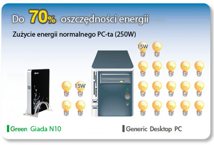 Mini PC Giada wspomagany jest procesorem Intel Atom, dziêki czemu jest niebywale energooszczêdny, zachowuj±c przy tym du¿± wydajno¶æ pracy, czego dowodem jest system Windows Vista czy 7 który dedykowany jest dla tego urz±dzenia.