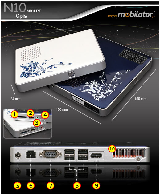Nowoczesny wygl±d N10 inspirowany jest gracj± i stylem baleriny. Elegancka, oszczêdzaj±ca przestrzeñ forma czyni z niego najmniejszy na ¶wiecie komputer PC. Wielkie rzeczy znajduj± siê w ma³ych opakowaniach, N10 nie jest tu wyj±tkiem z ca³ym zestawem portów wej¶cia i wyj¶cia zapewniaj±cym pe³n± ³±czno¶æ.