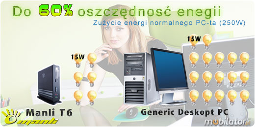 Manli T6 dziêki wydajnemu procesorowi Intel® Core™ i3-4130T zapewnia do 60% wiêksz± oszczêdno¶æ w porównaniu z tradycyjnym komputerem stacjonarnym.