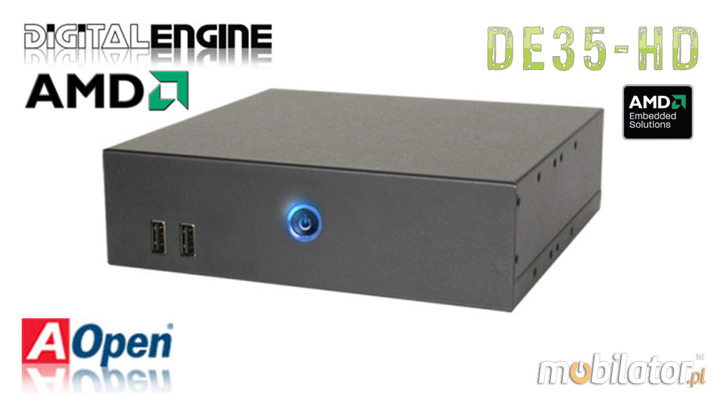 Dzięki zastosowaniu najnowszych technologii w MiniPC DE35-HD Digital Engine jest przystosowany do ciagłej wielozadaniowej pracy przy niskim zużyciu energii(65W). Istotną zaletą jest skuteczne połączenie małych wymiarów ze sporym potencjałem przez użycie wydajnych procesorów z rodziny AMD Dual core T56N (2x1.6GHz), Chipsetu (Hudson E1-A55E) oraz możliwości rozbudowy pamięci DDR3 (do 8GB). Zintegrowany układ audio-wizualny pozwala na odtwarzanie aplikacji (obraz, dźwięk).Przestrzeń dyskowa oferuje do dyspozycji (maksymalnie) 500GB HDD lub 128GB SSD.