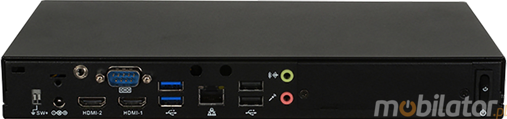 Zintegrowana karta sieciowa - Realtek 8111DP GbE LAN (opcjonalnie moduł WiFi) umożliwiaja podłączenie urządzenia do sieci. Komputer wyposażony jest w: jedno złącze LAN, trzy porty COM(RS232), jeden port COM(RS485), dwa porty USB 3.0, cztery porty USB 2.0, dwa wyjścia HDMI, jedno wejście Audio, jedno wejście mikrofonowe.