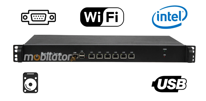 MiniPC yBOX-1U posiada 6 wbudowanych kart sieciowych Intel, które mogą pracować w szybkiej sieci Gigabit Ethernet.