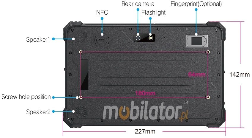 Tablet przemysłowy Mobipad 08DS-RTNL stworzono do pracy w trudnych warunkach – od hal produkcyjnych po otwarte place budowy. Obudowa zgodna z normą IP68 chroni przed pyłem i wodą, a dodatkowe uszczelnienia zabezpieczają podzespoły przed wstrząsami i skutkami upadków z 1,2 m. Wzmocnione narożniki oraz antypoślizgowe krawędzie gwarantują pewny chwyt i wygodną obsługę nawet w wymagającym terenie.