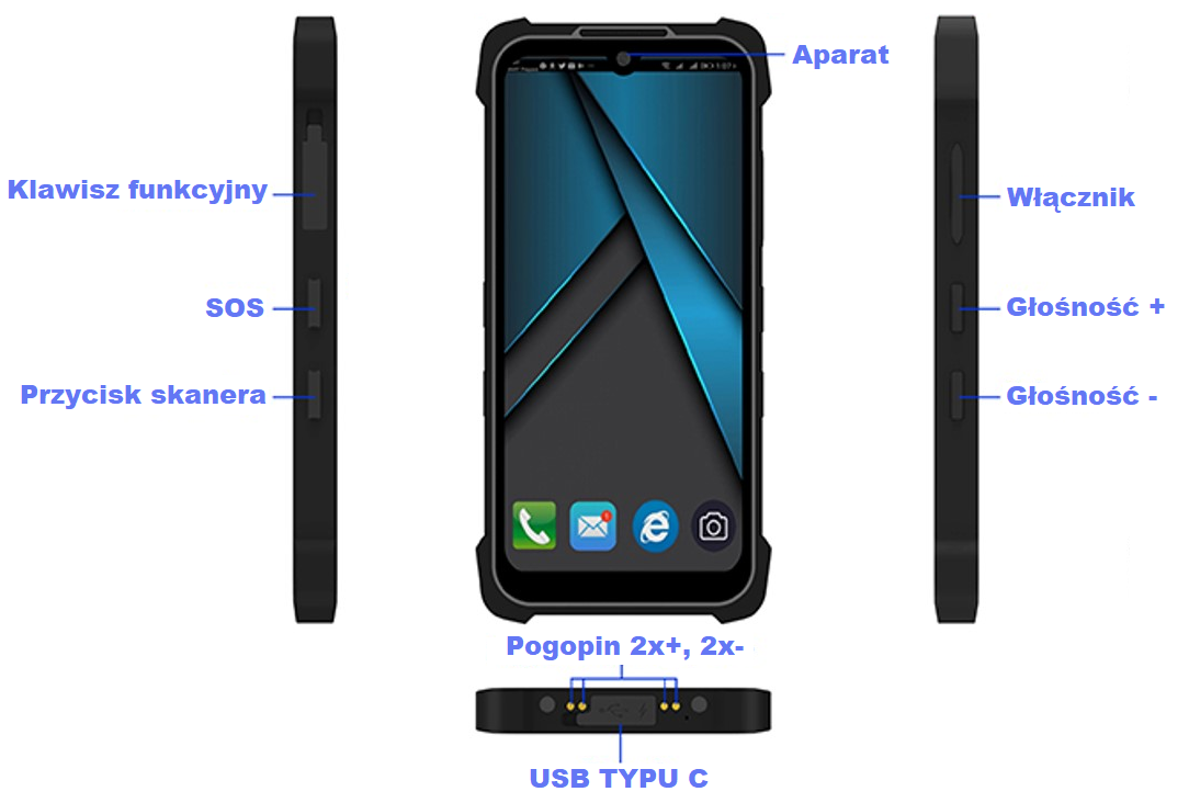 Wzmocniony smartfon MobiPAD MS5 został stworzony z myślą o odporności i wygodzie. Wytrzymała obudowa o grubości 11.5mm oraz stylowy design sprawią, że będzie bardzo dobrze sprawdzał się w warunkach przemysłowych i nie tylko. Unikatowy rozmiar został starannie przemyślany, aby urządzenie było bardziej poręczne i ergonomiczne. Antypoślizgowa obudowa sprawia, że bezpiecznie i pewnie będziesz go trzymał w dłoni, a gumowe narożniki dodatkowo zabezpieczą urządzenie przed możliwymi uszkodzeniami w wyniku upadków. W przypadku wersji urządzenia z opcjonalnym skanerem kodów 2D, urządzenie w najgrubszym miejscu ma 17.2mm.