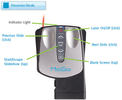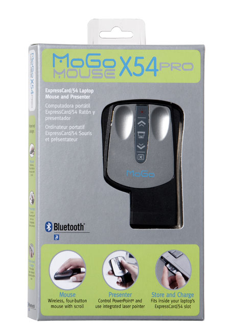Prezentacyjna Myszka Mogo X54 jest kombinacj± bezprzewodowego prezentera oraz myszki, któr± chowamy i ³adujemy w slocie ExpressCard twojego notebooka. Myszka Mogo opieraj±ca swoje dzia³anie na technologii Bluetooth™ umo¿liwia nam sterowanie prezentacj± nawet do 10 metrów od Notebooka. Myszka posiada wska¼nik laserowy o wysokiej mocy.