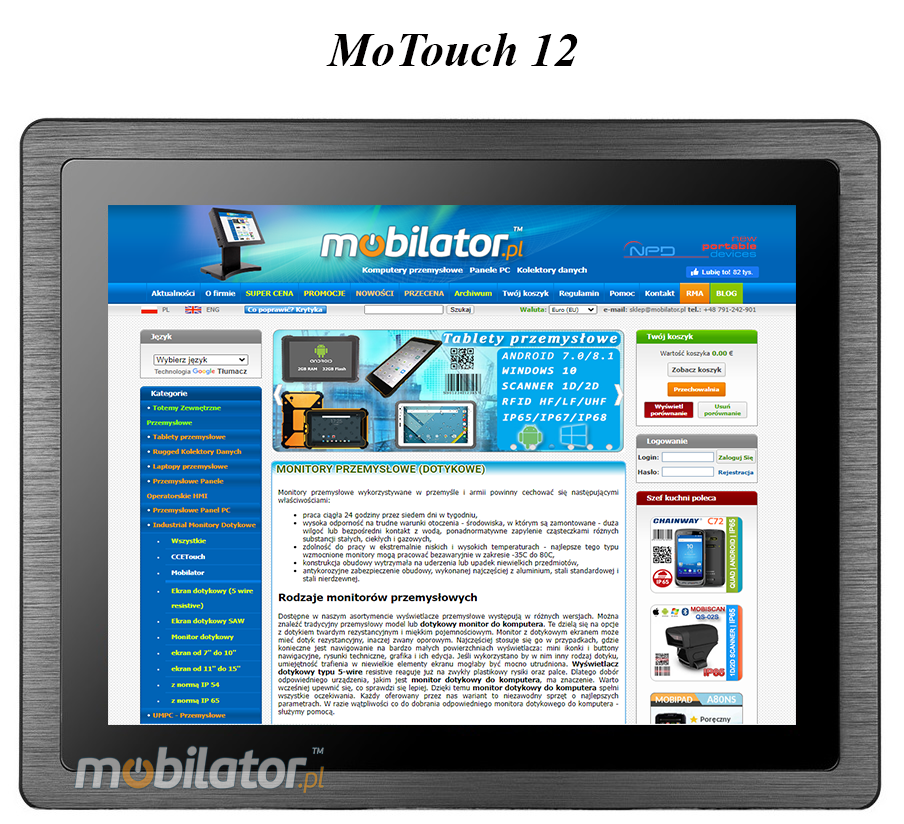 Monitor dotykowy MoTouch 12 posiada 12" ekran TFT LCD. Przy rozdzielczości 1024x768 i wysokiej jasności 500 cd/m2, ekran rezystywny z wysoką wrażliwością na dotyk, oferuje użytkownikowi wyraźny obraz i łatwość obsługi.