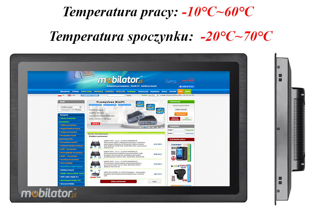 Monitor dotykowy MoTouch 185 przystosowany jest do ciągłej pracy zarówno w bardzo niskich, jak i wysokich temperaturach w przedziale od -10°C do 60°C. W przypadku przechowywania wyłączonego urządzenia, poradzi sobie on już z temperaturami w zakresie od -20°C do 70°C. Dodatkowo wytrzymały PanelPC świetnie sprawdzi się w pomieszczeniach ze zwiększoną wilgotnością, zapewniając prawidłowe funkcjonowanie nawet w przypadku 95% wilgotności względnej powietrza.