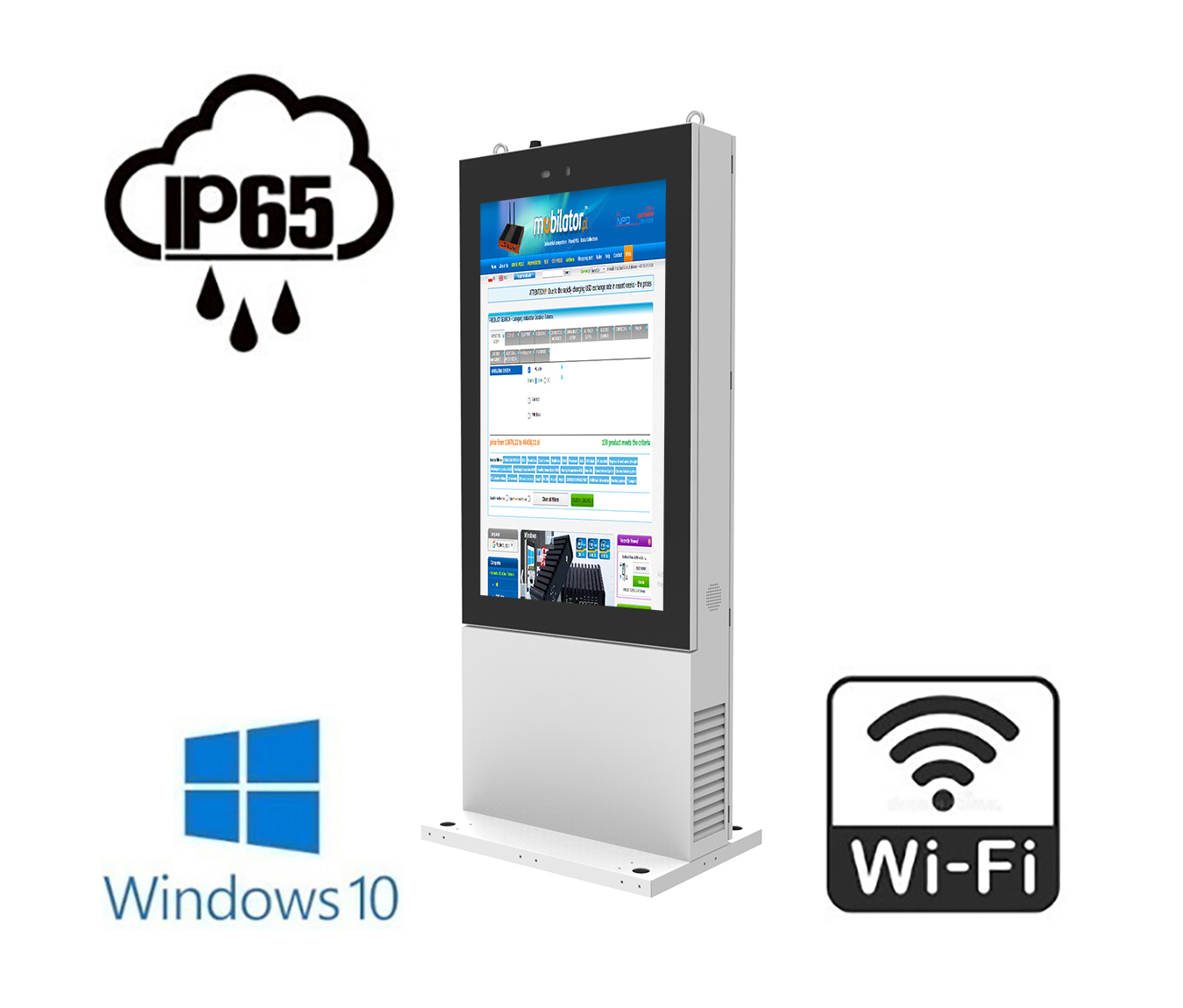 Obudowa panelu o wymiarach 2130mm x 880mm x 230mm została wykonana z najwyższej jakości metalu pokrytego powłoką galwaniczną, co zapewnia bardzo dużą odporność urządzenia na uszkodzenia mechaniczne i ciężkie warunki atmosferyczne, deszcz, mgłę, śnieg oraz szron. Model ten o wadze 130.0 kg, jest w każdej chwili gotowy do eksploatacji nawet w trudnych warunkach, takich jak upał czy zimno. Digital Singage Player - Windows 55 cale totem reklamowy, informacyjny NoMobi Trex to seria urządzeń przeznaczonych do zastosowań wymagających ciągłej pracy - 24 godziny, 7 dni w tygodniu.