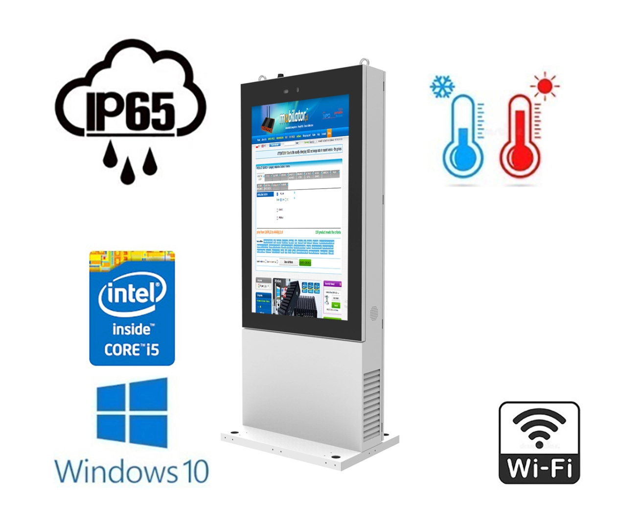 Obudowa panelu o wymiarach 2130mm x 880mm x 230mm została wykonana z najwyższej jakości metalu pokrytego powłoką galwaniczną, co zapewnia bardzo dużą odporność urządzenia na uszkodzenia mechaniczne i ciężkie warunki atmosferyczne, deszcz, mgłę, śnieg oraz szron. Model ten o wadze 130.0 kg, jest w każdej chwili gotowy do eksploatacji nawet w trudnych warunkach, takich jak upał czy zimno. Digital Singage Player - Windows 55 cale totem reklamowy, informacyjny NoMobi Trex to seria urządzeń przeznaczonych do zastosowań wymagających ciągłej pracy - 24 godziny, 7 dni w tygodniu.