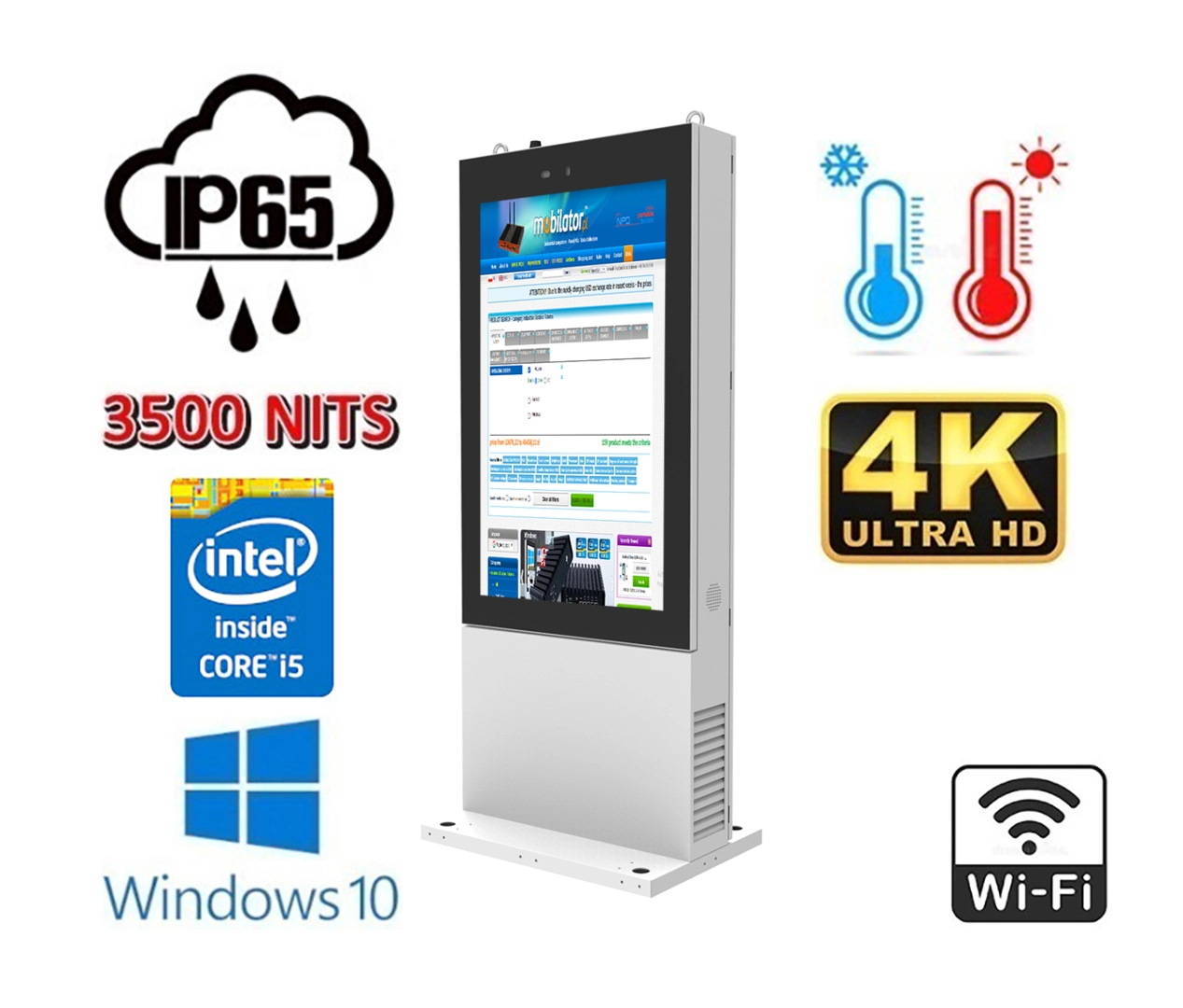 Obudowa panelu o wymiarach 2130mm x 880mm x 230mm została wykonana z najwyższej jakości metalu pokrytego powłoką galwaniczną, co zapewnia bardzo dużą odporność urządzenia na uszkodzenia mechaniczne i ciężkie warunki atmosferyczne, deszcz, mgłę, śnieg oraz szron. Model ten o wadze 130.0 kg, jest w każdej chwili gotowy do eksploatacji nawet w trudnych warunkach, takich jak upał czy zimno. Digital Singage Player - Windows 55 cale totem reklamowy, informacyjny NoMobi Trex to seria urządzeń przeznaczonych do zastosowań wymagających ciągłej pracy - 24 godziny, 7 dni w tygodniu.