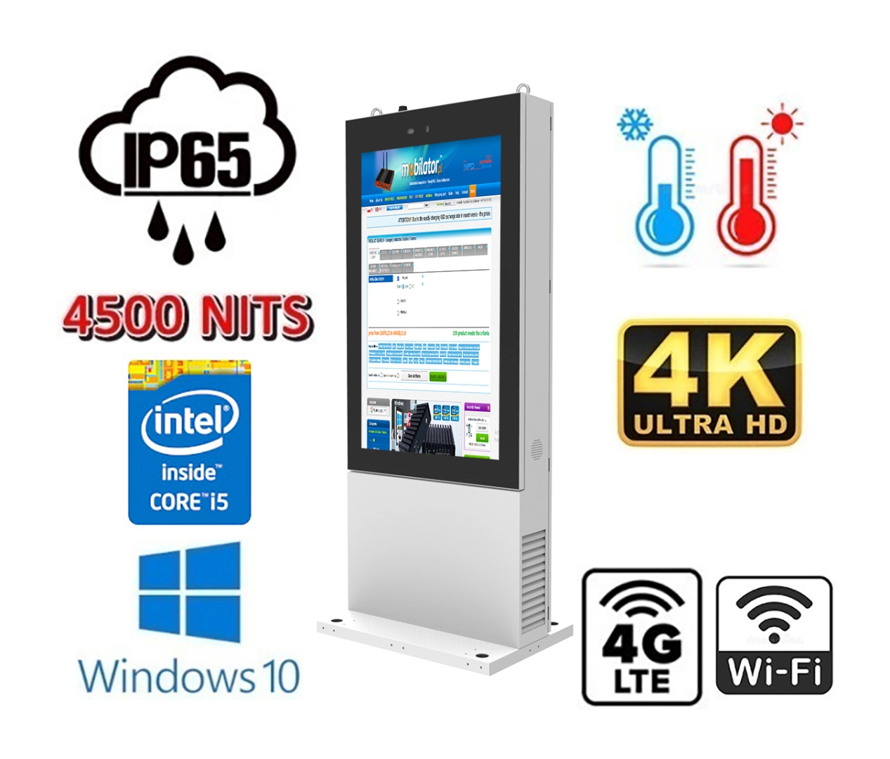 Obudowa panelu o wymiarach 2130mm x 880mm x 230mm została wykonana z najwyższej jakości metalu pokrytego powłoką galwaniczną, co zapewnia bardzo dużą odporność urządzenia na uszkodzenia mechaniczne i ciężkie warunki atmosferyczne, deszcz, mgłę, śnieg oraz szron. Model ten o wadze 130.0 kg, jest w każdej chwili gotowy do eksploatacji nawet w trudnych warunkach, takich jak upał czy zimno. Digital Singage Player - Windows 55 cale totem reklamowy, informacyjny NoMobi Trex to seria urządzeń przeznaczonych do zastosowań wymagających ciągłej pracy - 24 godziny, 7 dni w tygodniu.