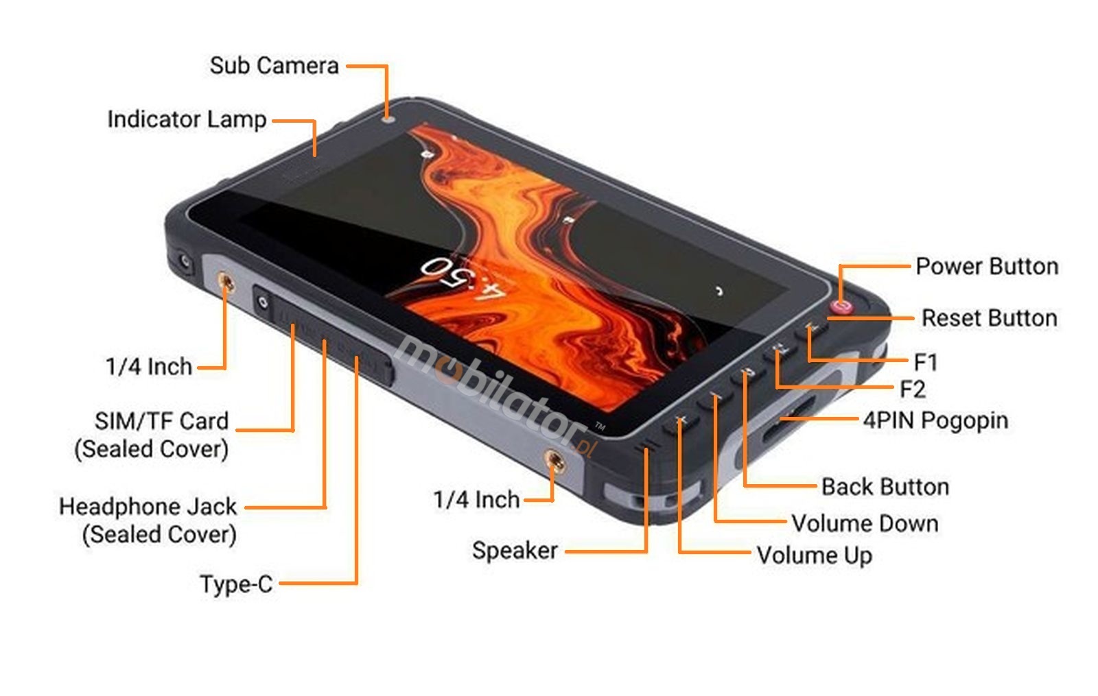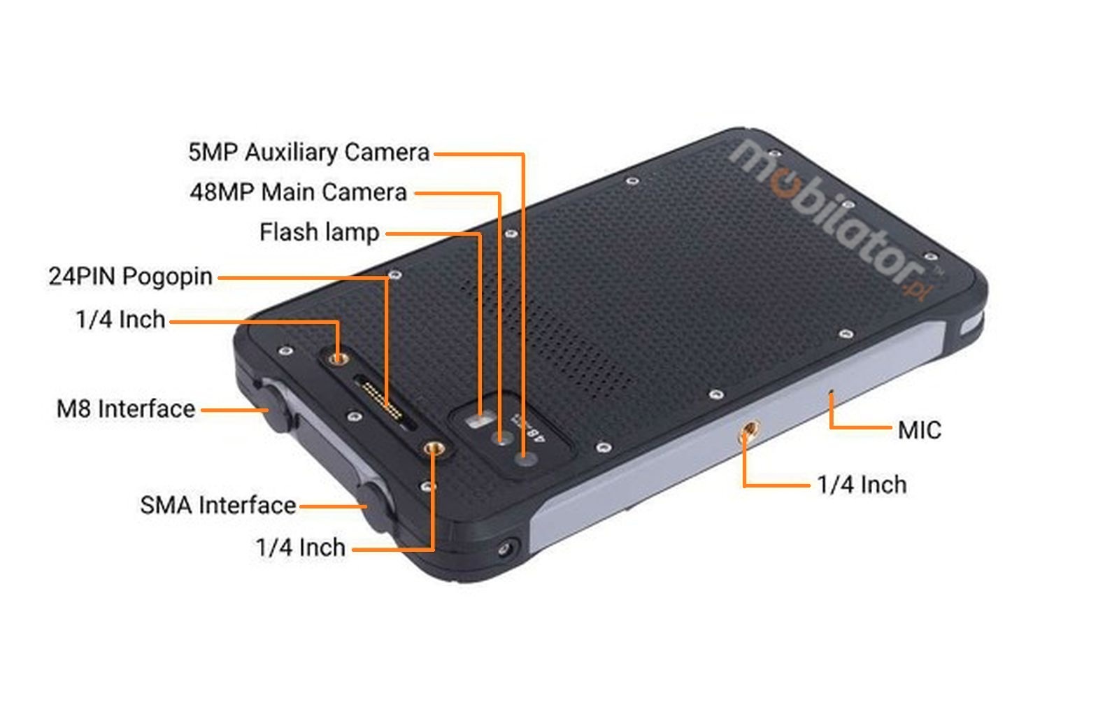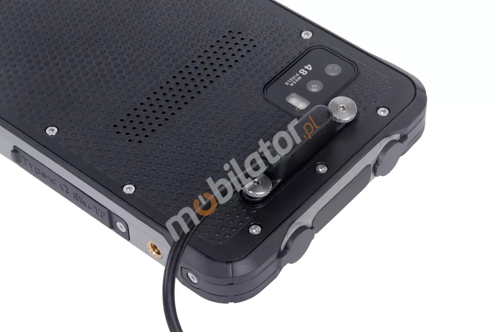Tablet oferuje zaawansowaną łączność dzięki portowi USB Type-C z funkcją OTG oraz 4-pinowemu złączu magnetycznemu. Urządzenie wyróżnia się przemysłowymi interfejsami: M8 Aero Head z obsługą RS232 oraz 24-pinowym złączem rozszerzeń wspierającym standard TTL i USB Host. Elastyczność komunikacji zapewnia potrójny slot, pozwalający na jednoczesne korzystanie z dwóch kart nano-SIM oraz karty microSD. Za precyzyjne działanie odpowiada bogaty zestaw czujników, w tym żyroskop, akcelerometr, czujnik geomagnetyczny oraz światła. System zasilania wspiera protokół szybkiego ładowania PD, oferując szeroki zakres napięć od 5V do 12V. Całość konstrukcji jest zoptymalizowana pod kątem stabilnego przesyłu danych i niezawodnego zasilania w wymagających warunkach.