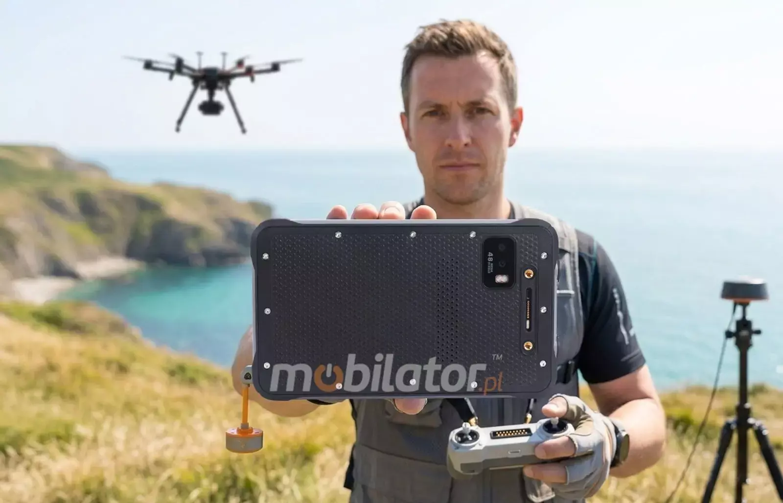 Parametry techniczne tabletu MobiPAD 7720X 5G zostały zoptymalizowane pod kątem profesjonalnego pilotażu dronów. Kluczowym elementem jest 7-calowy wyświetlacz FHD (1920x1080) o ponadprzeciętnej jasności 2600 nitów, która zapewnia bezproblemową obsługę bez konieczności stosowania osłon przeciwsłonecznych. Urządzenie o wymiarach 213 x 126 x 22 mm mieści się w standardowych systemach mocowań, oferując jednocześnie najwyższą odporność mechaniczną. Połączenie kompaktowej formy z matrycą o wysokiej gęstości pikseli i ogromnej sile świecenia pozwala na precyzyjne monitorowanie obrazu z drona w czasie rzeczywistym.