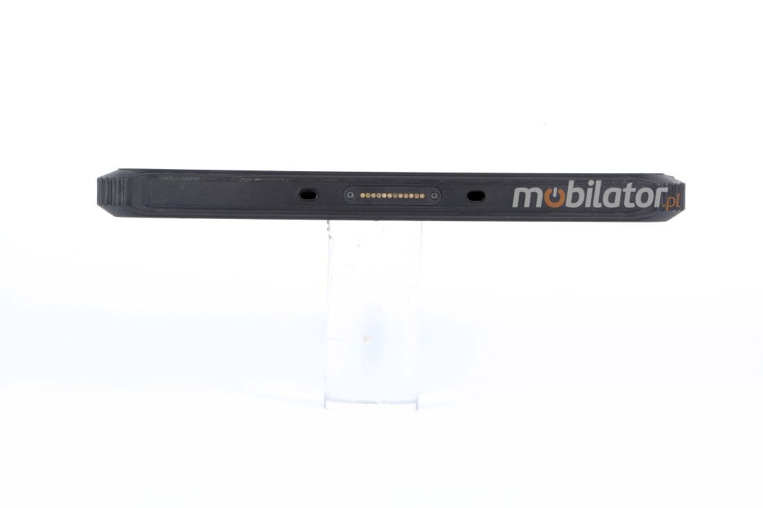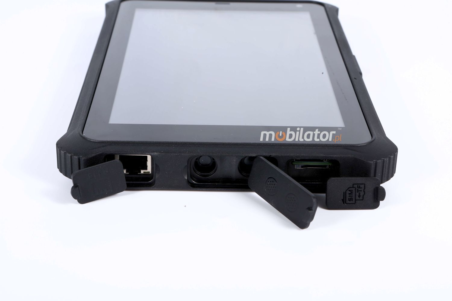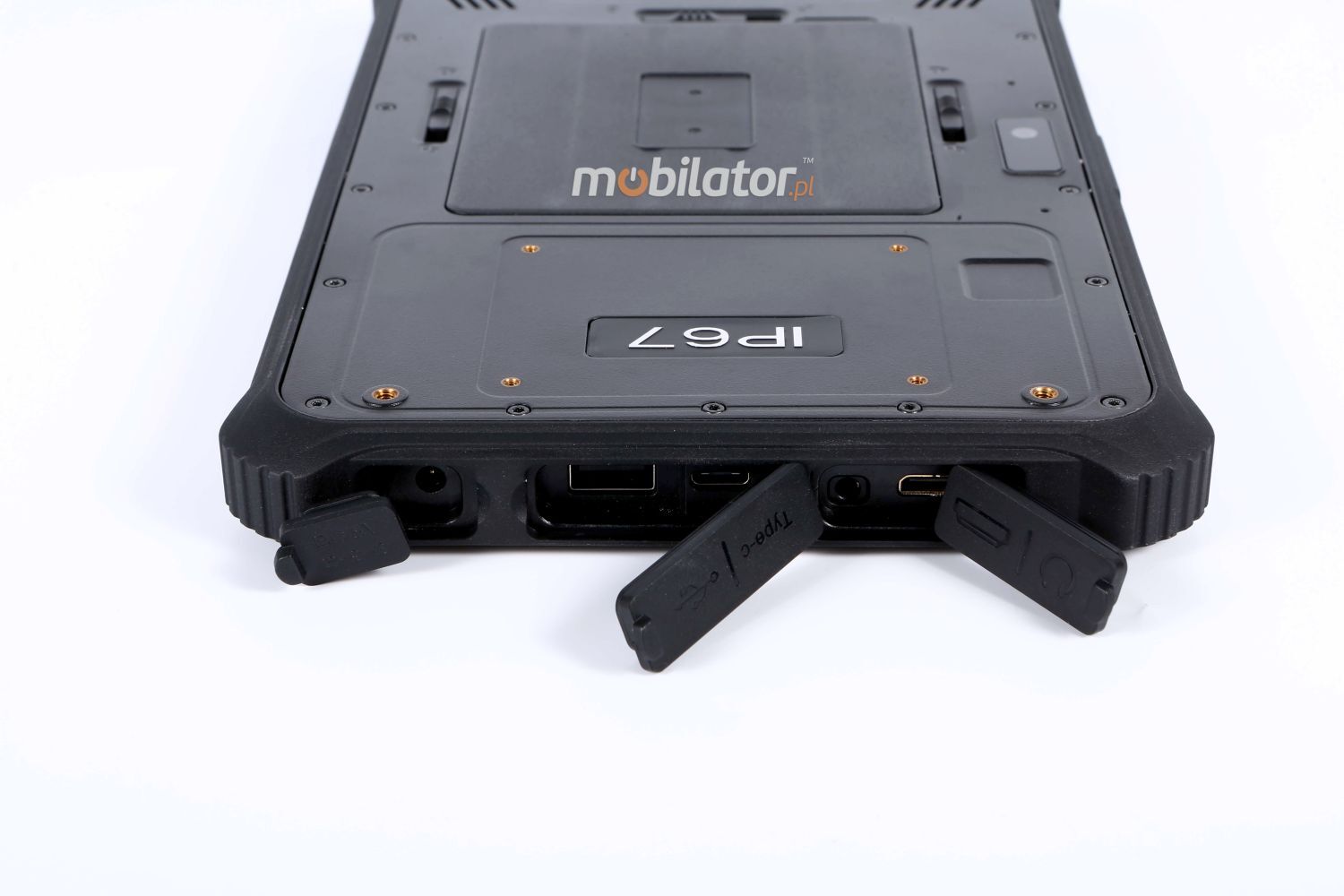 Urządzenie wyposażono w dwa głośniki, dwa mikrofony oraz bogaty zestaw portów: USB-C, USB-A (2.0), dedykowane gniazdo zasilania DC 5,5 V / 3 A oraz wyjście audio Jack 3,5 mm. Stabilną łączność i obsługę sieci zapewnia slot Micro SIM, gigabitowy port RJ45 oraz złącze PogoPin do stacji dokującej. Kluczowym wyróżnikiem są dwa niezwykle wytrzymałe złącza lotnicze (aviation plug), które gwarantują stabilne połączenie z profesjonalnymi akcesoriami przemysłowymi, takimi jak czytniki RFID, skanery kodów czy zewnętrzne moduły sterujące, bez ryzyka przypadkowego rozłączenia.