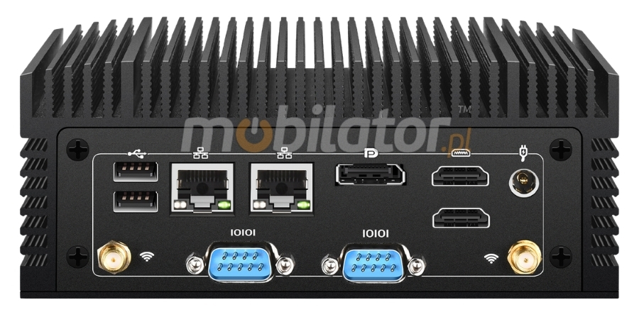 Tylny panel wejść i wyjść wysokowydajnego urządzenia MobiPad nBOX MC8F-4C2L został starannie zaprojektowany z myślą o najwyższej niezawodności oferując klasyczne gniazdo zasilania DC IN zapewniające stabilny dopływ niezbędnej energii roboczej. Błyskawiczną i bezproblemową łączność sieciową w tej konstrukcji realizują dwa wydajne porty Gigabit LAN gwarantujące doskonały transfer pakietów danych z przepustowością sięgającą 1000 megabitów na sekundę. Transmisja najwyższej jakości sygnału wideo do zewnętrznych monitorów odbywa się za pośrednictwem dwóch złączy HDMI 2.0 oraz jednego gniazda DP 1.4 , które bez jakichkolwiek opóźnień wspierają wyświetlanie niezwykle szczegółowego obrazu w rozdzielczości 4K przy płynnej częstotliwości odświeżania wynoszącej 60 Hz. Sekcja tylna obudowy obejmuje również jeden niezwykle nowoczesny port USB 3.0 typu C oraz dwa dodatkowe gniazda komunikacyjne USB 2.0 co doskonale ułatwia organizację pracy z wieloma zewnętrznymi peryferiami bez konieczności ingerencji w przedni interfejs. Ogromnym atutem rozszerzającym komercyjne i specjalistyczne zastosowanie tego sprzętu w sektorze przemysłowym są dwa dedykowane porty szeregowe COM pracujące w niezwykle popularnym standardzie RS232, które dają pewność pełnej kompatybilności z zaawansowanymi sterownikami maszyn, skanerami logistycznymi oraz profesjonalną aparaturą pomiarową powszechnie stosowaną w rozbudowanych systemach nowoczesnej automatyki.