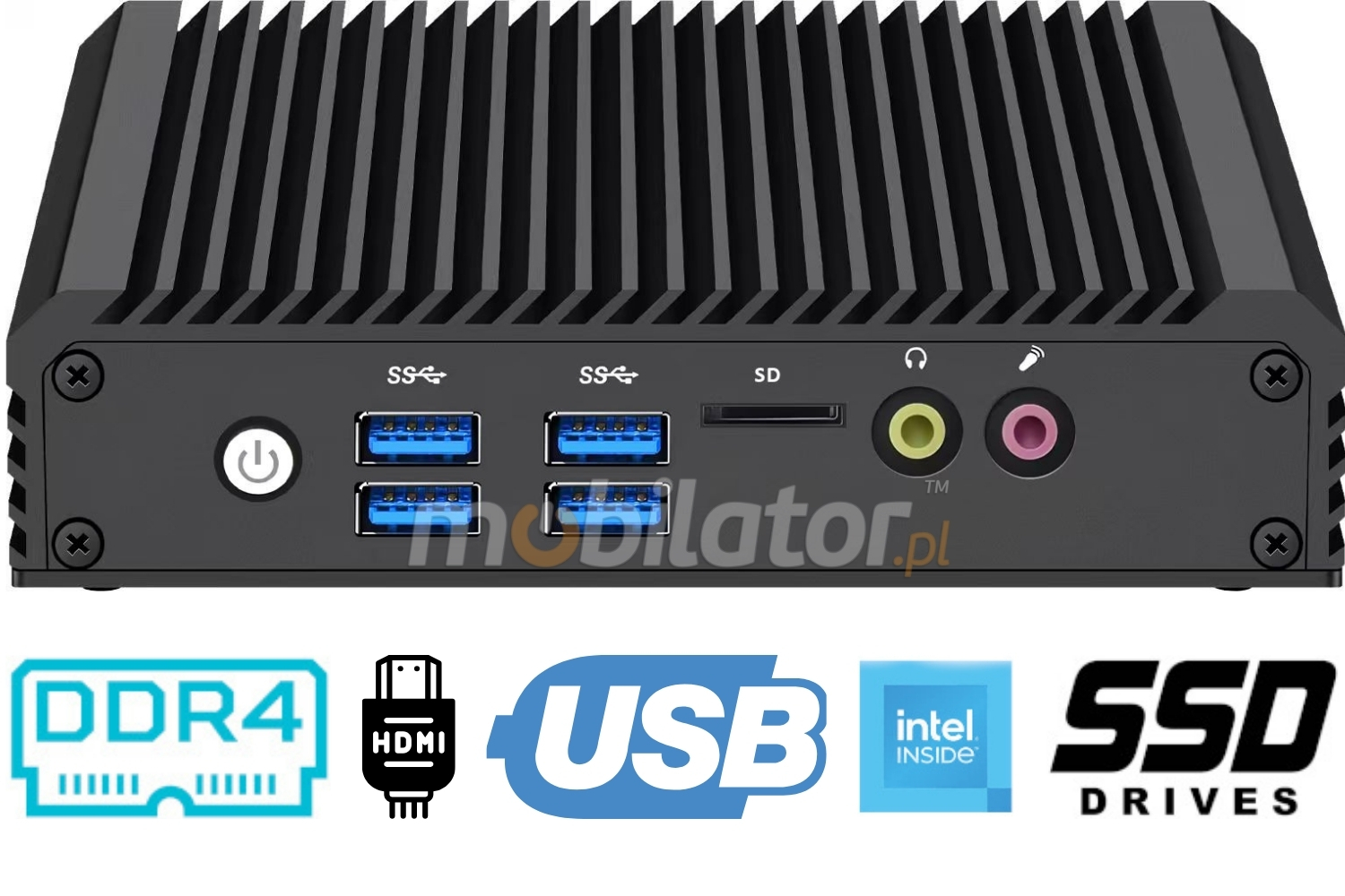 Istotnym atutem operacyjnym komputera MobiPad nBOX MV3-2LAN jest w pełni metalowa konstrukcja, która pełni funkcję efektywnego, pasywnego radiatora odprowadzającego ciepło. Takie rozwiązanie projektowe umożliwia skuteczne przekazywanie energii cieplnej wytwarzanej przez czterordzeniową jednostkę Intel N150 na zewnątrz obudowy bez potrzeby montowania aktywnych systemów chłodzenia.