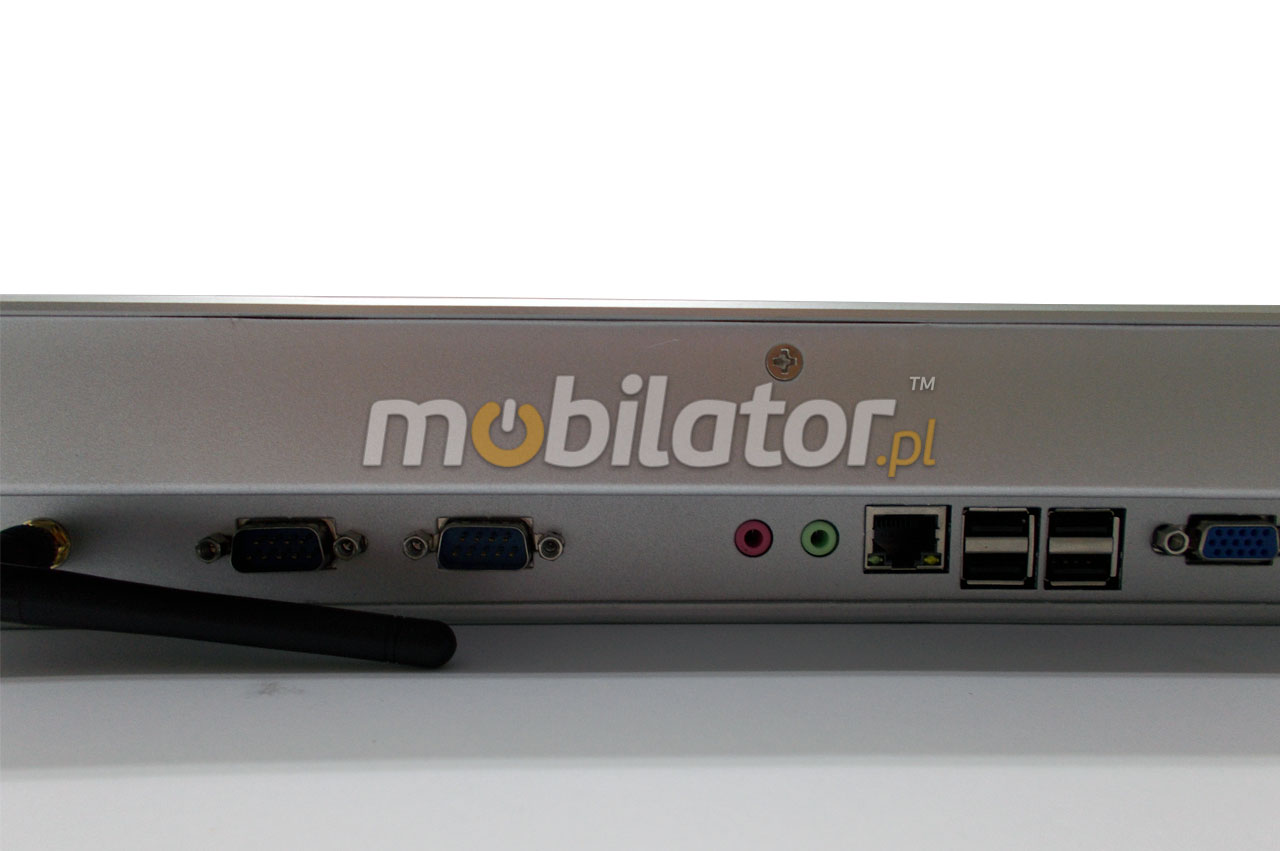 Zintegrowana karta sieciowa Intel RTL811E Gigabit LAN 1xRJ-45, WIFI umożliwia podłączenie urządzenia do sieci. Komputer wyposażony jest w: jedno złącze LAN, w dwa porty COM(RS232), jedno wyjście VGA, jedno wyjście HDMI, cztery porty USB 2.0, jedno wejście Audio, jedno wejście mikrofonowe oraz wzłącze zasilania.