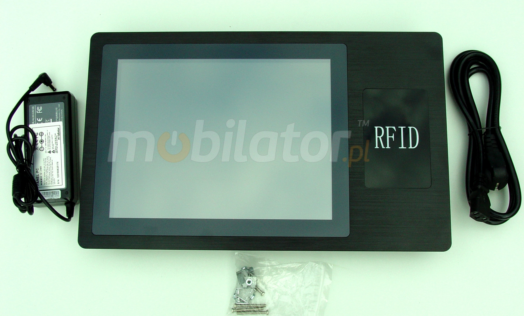 RFID to technologia stosowana do identyfikacji obiektów oraz kontroli przepływu produktów. Odczytywanie informacji ze specjalnych tagów, które przymocowuje się do przedmiotów (ale nie tylko, gdyż RFID znajduje zastasowanie także do znakowania zwierząt, a nawet ludzi) następuje drogą radiową. W zależności od rodzaju tagu zmienia się ilość informacji, które może on przechowywać jak i również maksymalna odległość, z której można odczytać dane. Tagi RFID, to alternatywa dla kodów kreskowych - wygodniejsza i bardziej wydajna. W tym modelu zamontowany został czytnik typu RFID HF pracujący na częstotliwości 13,56 MHz. Stosowany w urządzeniu czytnik działa w trybie wirtualnego portu COM. W związku z tym potrzebne jest dodatkowe oprogramowanie by zapisywać sczytywany kod w formie tekstowej.